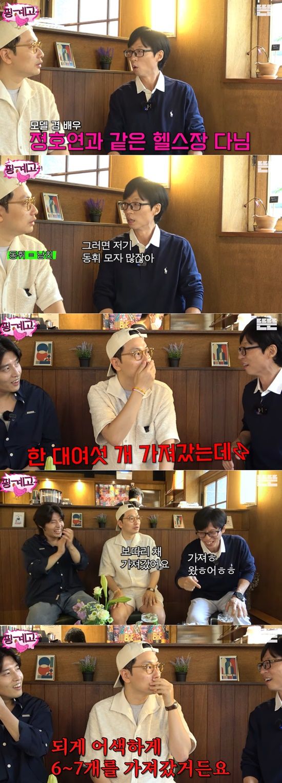 유재석은 "정호연과 가끔 보는데 어느 날 농담 삼아 '모자 하나만 달라' 얘기했다. 고민해 본다고 하더니 며칠 지나서 '제가 모자를 하나 지금 사러 갈까 하는데 어떤 스타일을 좋아하냐'고 묻더라"고 떠올렸다.