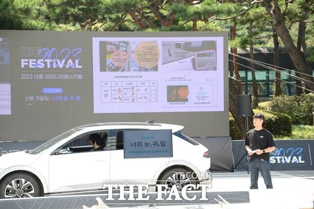 경기 화성 남양연구소에서 열린 '2023 아이디어 페스티벌' 본선에 '선행개발팀'이 수화 통역 서비스 '눈귀입'을 시연하고 있다. /김태환 기자