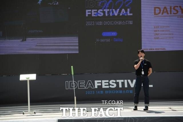 경기 화성 남양연구소에서 열린 '2023 아이디어 페스티벌' 본선에 '햅틱 네비게이터'를 개발한 'H-sense'팀이 발표를 하고 있다. /김태환 기자