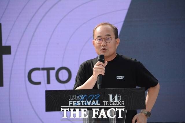 김용화 현대차·기아 CTO 사장이 22일 경기 화성시 남양연구소에서 열린 '2023 아이디어 페스티벌'에 참석해 인사말을 하고 있다. /김태환 기자