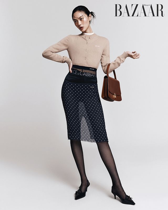 카디건, 같은 소재 톱, 도트 패턴 스커트, 슬링백, 스타킹은 모두 Miu Miu. 화이트 티셔츠는 Givenchy. 브리프는 40만원 Dolce amp; Gabbana. 백은 5백만원대 The Row.