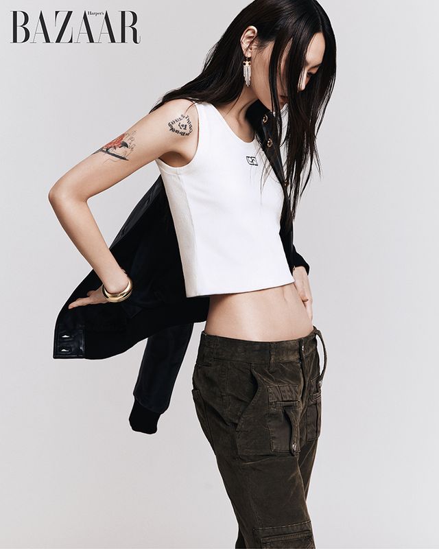 레더 재킷, 귀고리, 뱅글, 반지는 모두 Celine by Hedi Slimane. 탱크톱은 Ports 1961. 팬츠는 1백78만원 Blumarine.