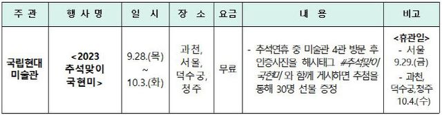 기관별 휴관일을 보면 국립박물관(소속관 포함), 국립민속박물관, 대한민국역사박물관, 국립한글박물관, 국립현대미술관 서울 등은 추석 당일 휴관한다. 국립현대미술관 과천·덕수궁·청주는 10월4일 대체 휴관한다.