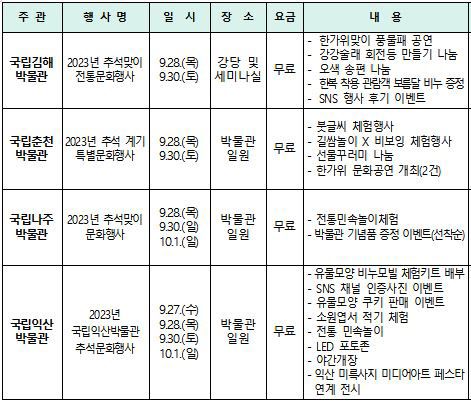 국립중앙박물관에서는 휴관일을 제외하면 특별전 ‘영원한 여정, 특별한 동행: 상형토기와 토우장식 토기’를 무료로 관람(9월28일~10월9일)할 수 있다. 유네스코 인류무형문화유산 공연 ‘2023 위대한 유산 오늘과 만나다(9월28일~10월3일)도 볼 수 있다. 지방 국립박물관(경주, 광주, 전주, 대구, 부여, 진주, 청주, 김해, 춘천, 나주, 익산)에서는 민속놀이 체험, 전통 공연, 가족영화 상영, 누리소통망(SNS) 행사 등 다채로운 문화행사를 진행한다.