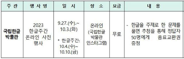 대한민국역사박물관에서는 한미동맹 70주년 기념 특별전을 총결산하는 ‘동행’(12월31일까지) 전시를 관람할 수 있다. 국립한글박물관에서는 한글주간(10월4~10일)을 맞이해 추석 연휴 기간에 참여할 수 있는 온라인 행사를 진행한다.