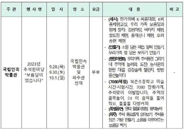 국립민속박물관에선 풍년을 축하하고 감사하는 의미를 담은 ‘2023 국립민속박물관 추석 한마당-보름달이 떴습니다’를 개최한다. 평택 농악, 영덕 월월이청청 공연, 첫 수확을 축하하는 세시 체험 등을 운영한다.