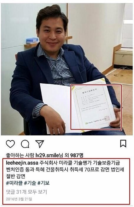 2016년 당시 강효상 새누리당(현 국민의힘) 의원실을 통해 입수한 자료에 따르면 이씨 형제는 벤처기업 인증을 받기 위해 2015년 8월 말 ‘발명자 이희진 전 미라클인베스트먼트 대표, 이희문 전 미래투자파트너스 대표 외 2명’이 특허청에 3가지 출원을 신청했다.