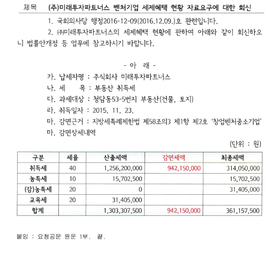 미래투자파트너스의 경우 벤처기업 인증을 받은 2015년 11월5일 이후 한 달도 채 되지 않은 11월23일 청담동에 200억원대 건물과 토지를 취득했다. 이때 벤처기업 인증을 통해 12억5000만원의 세금 중 9억4000만원의 세제 혜택을 받았다.