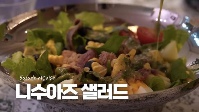 프랑스 니스에서 즐겨먹는 니수아즈 샐러드. 감자, 줄기 콩, 아티초크, 계란을 순서대로 삶아 익히고 방울 토마토, 로메인, 올리브도 적당히 잘라 모두 그릇에 넣는다. 그 위에 참지를 가득, 옥수수와 엔초비를 취향대로 올린다. 디종 머스타드, 식초, 올리브 오일, 쯔유, 레몬즙, 잘게 다진 이탈리안 파슬리, 바질을 섞어 드레싱을 만들고 뿌려주면 끝!
