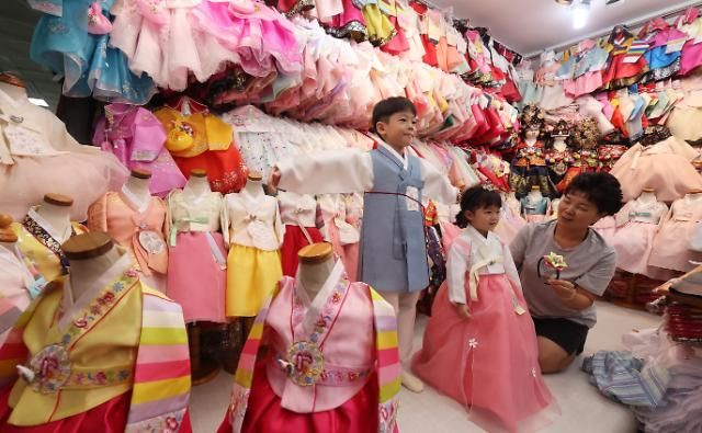 临近中秋,韩国小朋友正在挑选韩服准备过节。【图片提供 韩联社】