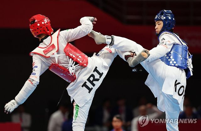 장준이 25일 중국 저장성 항저우의 린안 스포츠문화전시센터에서 열린 항저우 아시안게임 태권도 겨루기 남자 58㎏급 결승전에서 이란 마흐디 하지모사에이나포티에게 공격을 하고 있다. / 연합뉴스