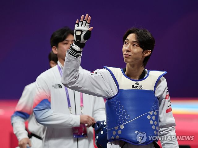 장준이 25일 중국 저장성 항저우의 린안 스포츠문화전시센터에서 열린 항저우 아시안게임 태권도 겨루기 남자 58㎏급 결승전에 앞서 관중석을 향해 인사하고 있다. / 연합뉴스