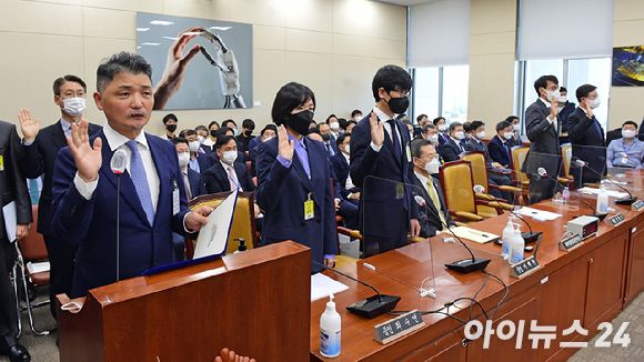 김범수 카카오 미래이니셔티브센터장을 비롯한 증인들이 24일 국회에서 열린 과학기술정보방송통신위원회의 과학기술정보통신부 및 소관 감사대상기관에 대한 종합감사에서 증인 선서를 하고 있다. 앞줄 왼쪽부터 김범수 센터장, 최수연 네이버 대표이사, 이해진 네이버 GIO, 홍은택 카카오 대표이사, 박성하 SK C&C 대표이사. [사진=아이뉴스24 DB]