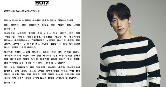 이같은 주장이 유튜버에 의해 세상에 공개되자, 비 소속사 레인 컴퍼니는 입장문을 통해서 "비와 관련된 매수인의 주장은 완전히 허위사실, 매도인이 단지 연예인이라는 이유로 도가 지나친 흠집 내기에 불과하다"라며 강경한 태도를 보였다.