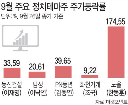 22대 총선 출마가 예상되는 인사들의 테마주도 움직이기 시작했다. 조국 전 장관의 테마주인 화천기계(010660)는 조 전 장관의 총선 출마 가능성이 제기된 지난 25일 상한가를 기록하는 등 강세를 이어가고 있다. 여권에서는 한동훈 법무부장관의 테마주인 노을(376930)이 정치테마 부상에 무상증자 권리락 효과가 겹쳐 오름세를 보였다.