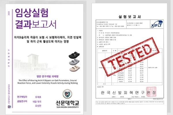 실제 임상실험 결과, 아치9 슬리퍼는 보행 시 초기입각기에 중요하게 사용되는 앞정강근과 가쪽넓은근의 근육 활성도를 높이고 엉덩이와 무릎관절을 높이 들게 해 발이 끌지 않게끔 도와주는 효과가 확인됐다. 또한 보행 시 일반 슬리퍼와 비교하여 과도한 좌우측 쏠림을 줄이고 지면 반발력을 줄일 수 있다는 결과가 도출됐다. (바로가기)