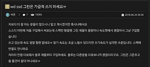 사실 이전부터 WD의 SSD제품군에는 상당한 문제점이 있었어. 2018년 시점에서도 가장 저렴한 제품인 WD SSD그린의 성능이 외부에 밝힌 스펙에 비해 현저히 떨어진다는 불만이 제기됐어. 퀘이사존 사용자 게시판에도 그린 제품의 쓰기 속도가 심각하게 느린데 컨트롤러칩도 그다지 믿을 만하지 않고 디램 캐시도 없기에 그냥 블루 제품 사라는 의견이 나와.