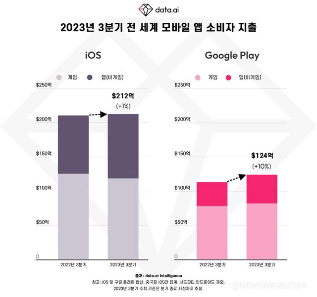 3분기 소비자 지출을 플랫폼별로 보면 iOS는 212억 달러(28조 원), 구글 플레이는 124억 달러(17조 원)다. iOS가 전체 소비자 지출 약 60%를 차지했다. 이어서 증가율은 iOS는 전년 동기 대비 1%에 그쳤지만 구글 플레이는 10% 상승했다.