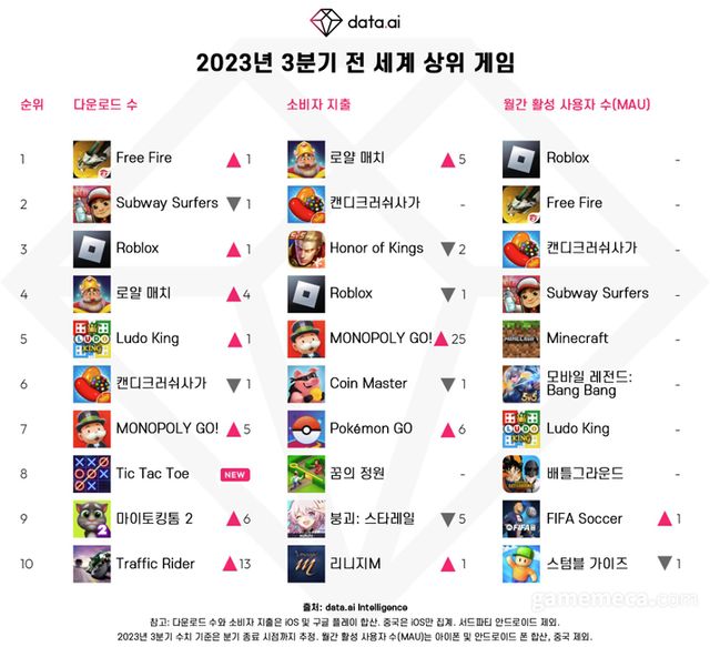 ▲ 2023년 3분기 전 세계 상위 10위 게임 (자료제공: data.ai)