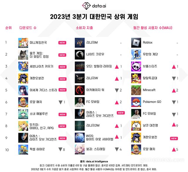 이어서 국내 3분기 게임 순위에는 다운로드 수에 미니게임천국, 세븐나이츠 키우기 등 신작이 입성했고, 소비자 지출 부문에서는 글로벌 순위 10위를 기록한 리니지M이 1위를 기록한 가운데, 카카오게임즈 MMORPG 신작 '아레스 : 라이즈 오브 가디언즈'가 7위에 안착했다. 월 활성화 이용자(MAU) 부문에서는 로블록스(Roblox), 무한의 계단, 브롤스타즈, 탕탕특공대 등 기존 인기작이 상위권을 지켰다.