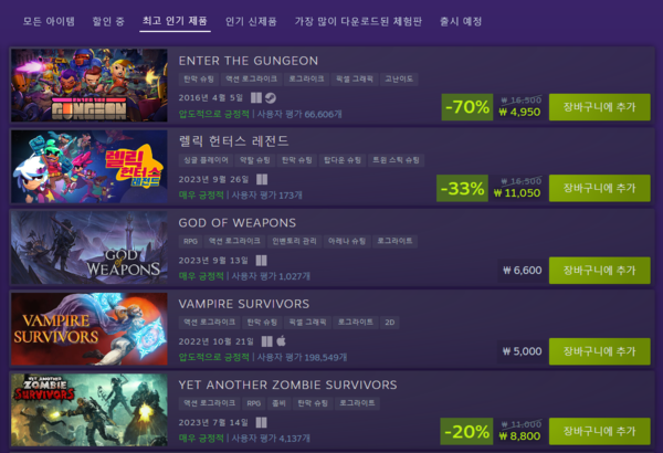 이번 행사에서는 장르 속 대표적인 인기작들은 물론 최근 출시된 관련 신작들 다수 또한 할인을 제공하며 게이머들의 이목을 끌고 있다. 최고 인기 제품으로는 ‘엔터 더 건전’. ‘렐릭 헌터스 레전드’, ‘갓 오브 웨폰’ 등이 판매량 상단에 이름을 올리고 있으며, 각각은 적게는 10% 할인부터 많게는 70% 할인에 이르기까지 폭넓은 할인을 제공하고 있다.