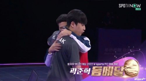 | 항저우 아시안게임 FC온라인 패자조 결승. 곽준혁이 경기 후 태국의 파따나삭과 포옹하고 있다. /아프리카TV 캡처 |