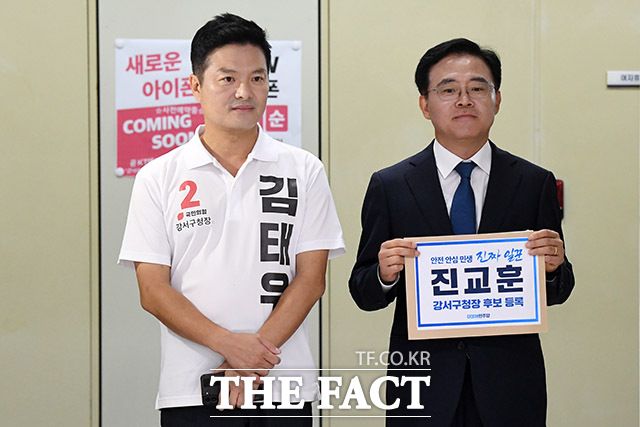 김태우 국민의힘 서울 강서구청장 후보(왼쪽)와 진교훈 더불어민주당 후보가 21일 오전 서울 강서구 선거관리위원회에서 다음 달 치러지는 강서구청장 보궐선거 후보자 등록을 하고 있다. /남용희 기자