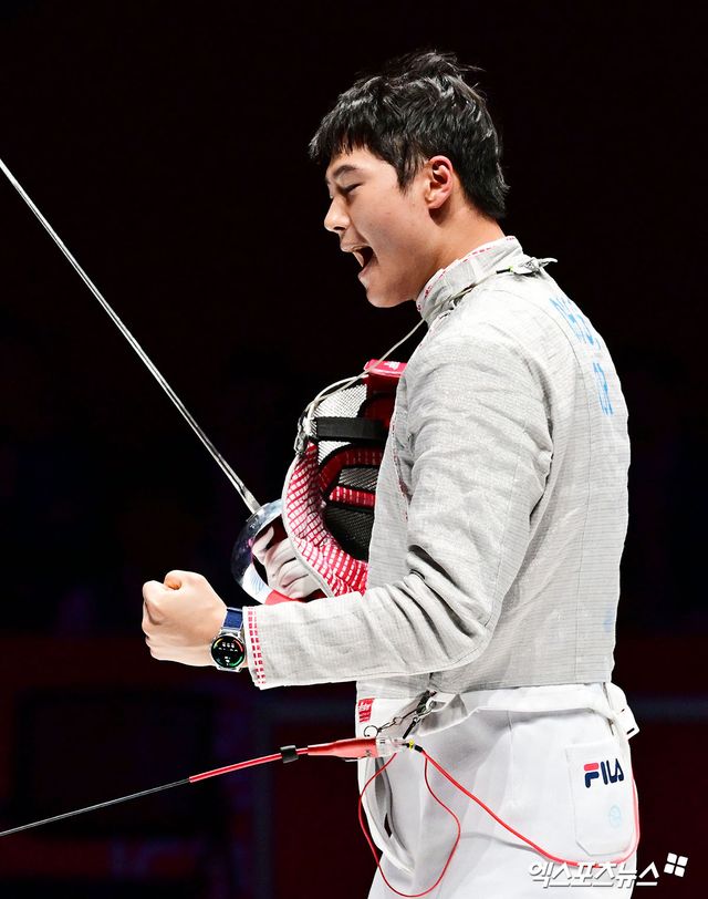 마지막 오상욱이 승부를 결정지었다. 선천펑에게 5-3으로 이겨 45-33으로 경기 종료됐다. 남자 사브르 대표팀이 금메달을 목에 거는 순간이었다.