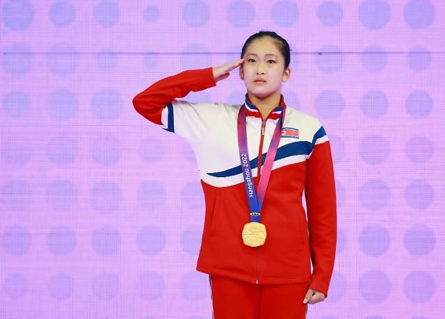 28日,在杭州黄龙体育馆举行的女子跳马决赛中,获得金牌的朝鲜选手安昌玉登上领奖台,向国旗敬礼。【图片来源 韩联社】