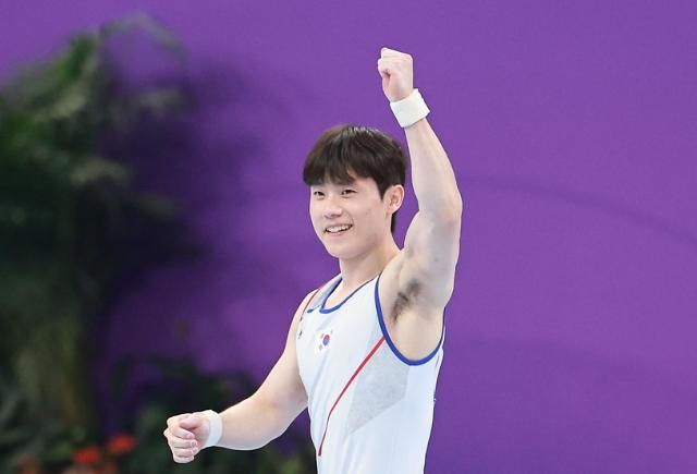 28日,在黄龙体操馆进行的男子自由体操决赛中,韩国选手金汉率结束比赛后,正向观众席致意。【图片来源 韩联社】
