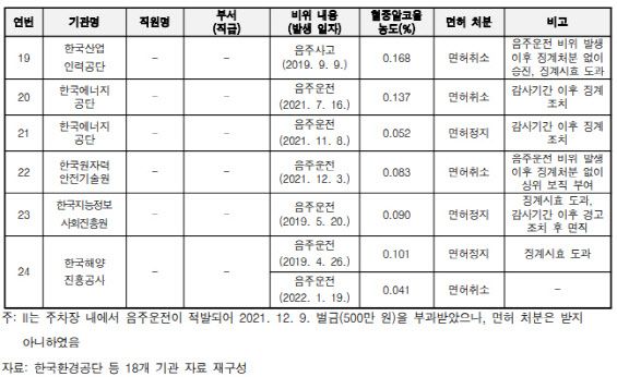 24명 중 한국환경공단 등 6명은 음주운전으로 인한 징계처분 대상인데도 징계시효가 지났거나(도과) 퇴직해 적정처분을 할 수 없게 됐다. 8명은 음주운전 이후 징계처분을 받지 않은채 승진하거나 상위 보직에 임명됐다.