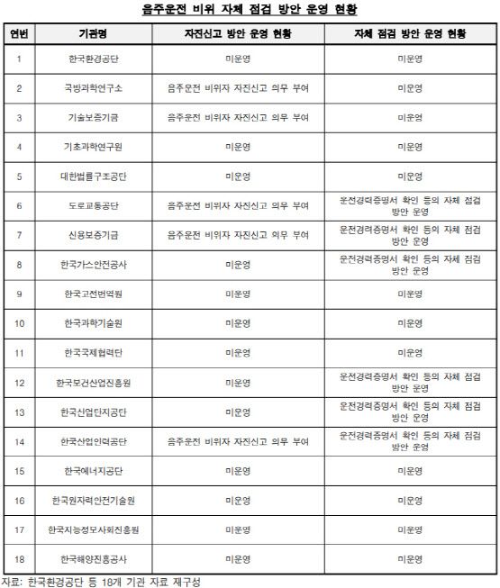 30일 감사원이 최근 발표한 출연출자기관 경영관리실태 보고서에 따르면 2019년 1월부터 2022년 8월 감사기간 동안 한국환경공단 등 18개 기관은 대부분 음주운전을 한 직원에 대한 신고 및 점검 방안이 미흡한 것으로 나타났다. 음주운전 징계규정이 있음에도 사실상 적발하려는 노력을 하지 않아 규정이 유명무실 했던 것이다.