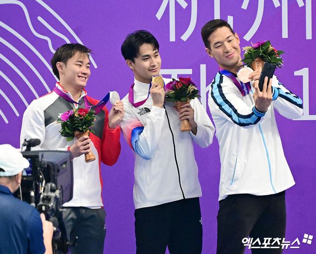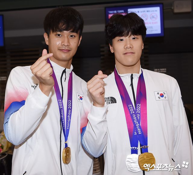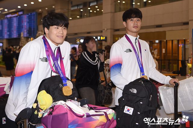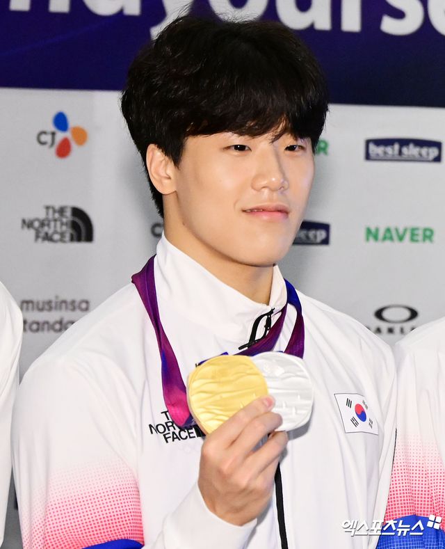 (엑스포츠뉴스 인천공항, 유준상 기자) 한국 수영의 '황금세대'로 불리는 황선우(20)와 김우민(22·이상 강원도청)만 빛난 게 아니다. 단거리 종목에서 나란히 '깜짝 금메달'로 모두를 놀라게 만든 지유찬(21·대구광역시청)과 백인철(23·부산광역시중구청)도 귀국하는 순간 큰 주목을 받았다.