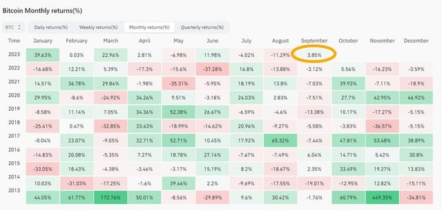 암호화폐 전문매체 코인텔레그래프가 코인글래스(CoinGlass) 데이터를 인용해 "비트코인(BTC)은 2016년 이후 최고의 9월을 기록했다"고 전했다.