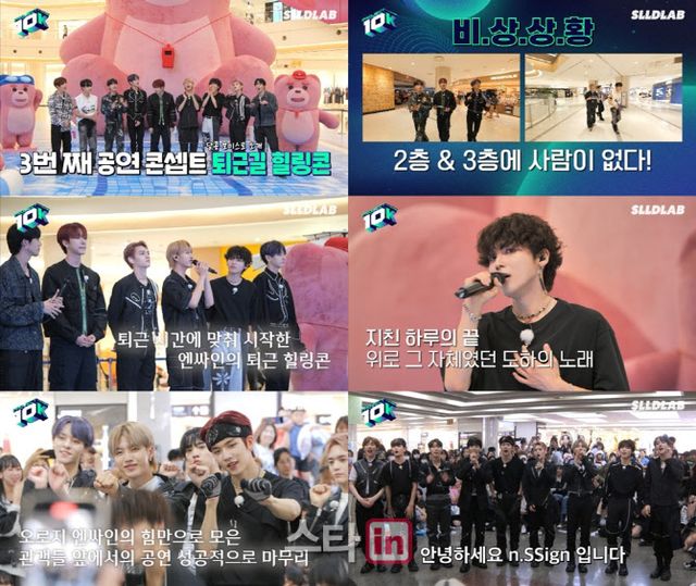 이날 엔싸인은 영등포 타임스퀘어에 모여 ‘퇴근길 힐링콘’이라는 제목의 게릴라 공연을 준비했다. 엔싸인은 “지친 하루를 보냈던 분들에게 저희가 작은 즐거움이라도 드릴 수 있으면 너무 좋을 것 같다”라고 밝혔다.