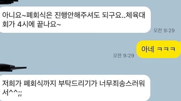 원래 4시에 끝이난다하여 뒤에일정을 맞춰놓았으나 이런저런 행사상황과 거기계신분들의 계속되는 요구들로 더보고더보고 하다보니 2시간 넘게 행사를 더보게되었고 폐회식까지도 모두 마무리하게되었다. 그리고 마지막 선물추첨만을 남기고 뒤에 일정과 약속때문에 관계자분들과 상의끝에 자리를 떴다. 총 9시간의 행사진행 목이 터져라 소리질러가며 정말 열심히보았다고 생각했는데( 그후로 실제로 한일주일간은 목소리가안나왔다.)