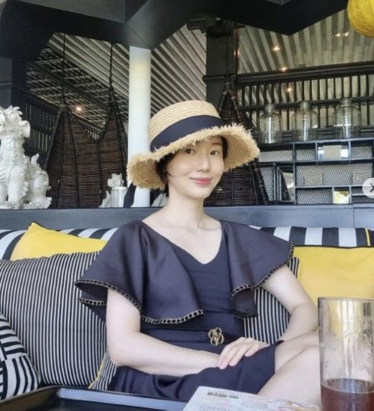 공개된 사진 속 이정현은 반팔 원피스 차림에 라탄 버킷햇을 쓰고 한 커피숍에서 여유로운 시간을 즐기고 있다.