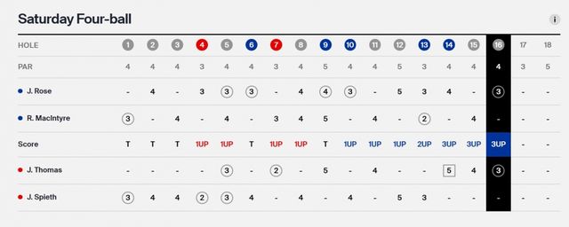 매치 15의 저스틴 로즈(잉글랜드)와 로버트 매킨타이어(스코틀랜드)가 저스틴 토마스-조던 스피스를 2홀 남기고 3홀차로 제치며 1점을 추가했다.