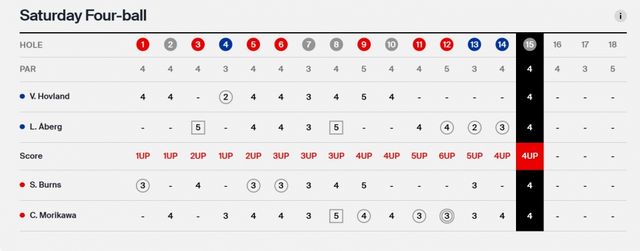 13매치 샘 번스-콜린 모리카와는 빅토르 호블란(노르웨이)-루트비히 아베리(스웨덴)를 맞아 3홀 남기고 4홀차로 꺾었다. 11번홀까지 5홀차로 앞서가던 미국은 아베리가 12번홀부터 연속 3개홀에서 디를 잡아냈지만 이글로 맞받아 2홀만 뺐기면서 이기는데는 지장이 없었다.