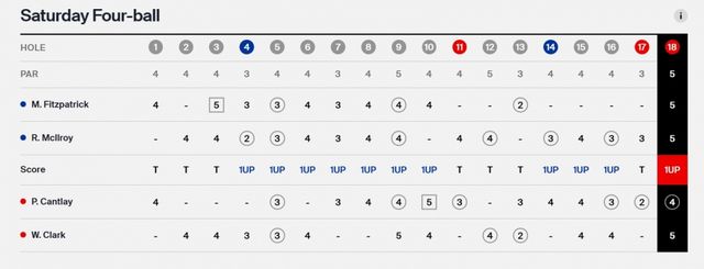 매치 16의 패트릭 캔틀레이-윈덤 클라크는 매슈 피츠패트릭(잉글랜드)-로리 매킬로이(북아일랜드)를 1홀차로 꺾었다. 17번홀까지 매킬로이가 버디를 6개 골라내며 리드하며 무승부로 벌이다가 18번홀(파5)에서 캔틀레이가 버디를 잡아 경기를 끝냈다.