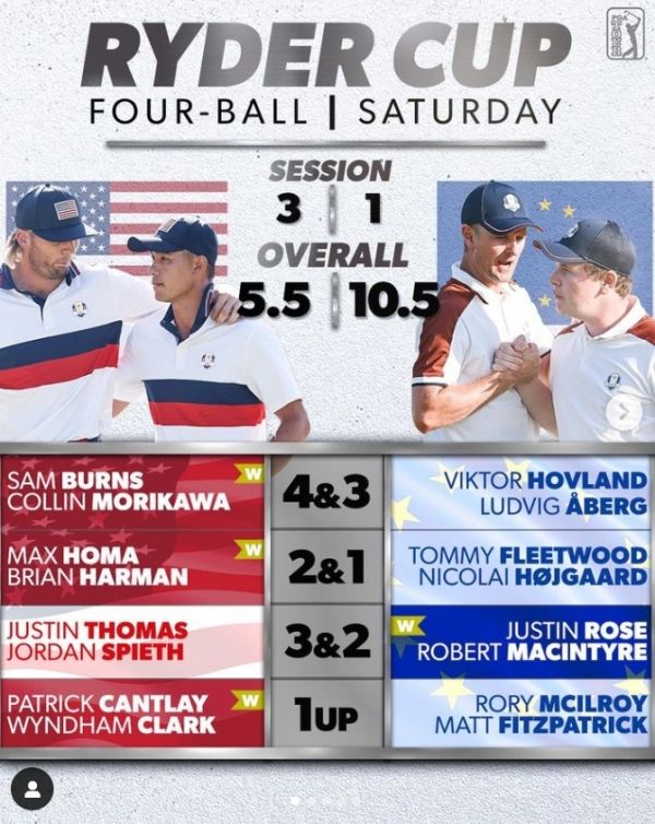 유럽은 이틀간 10.5점을 획득해 5.5점에 그친 미국을 따돌리고 우승 초읽기에 들어갔다. 유럽은 최종일 12명의 싱글매치에서 4명만 이기면 2021년 우승컵을 뒤찾는다.
