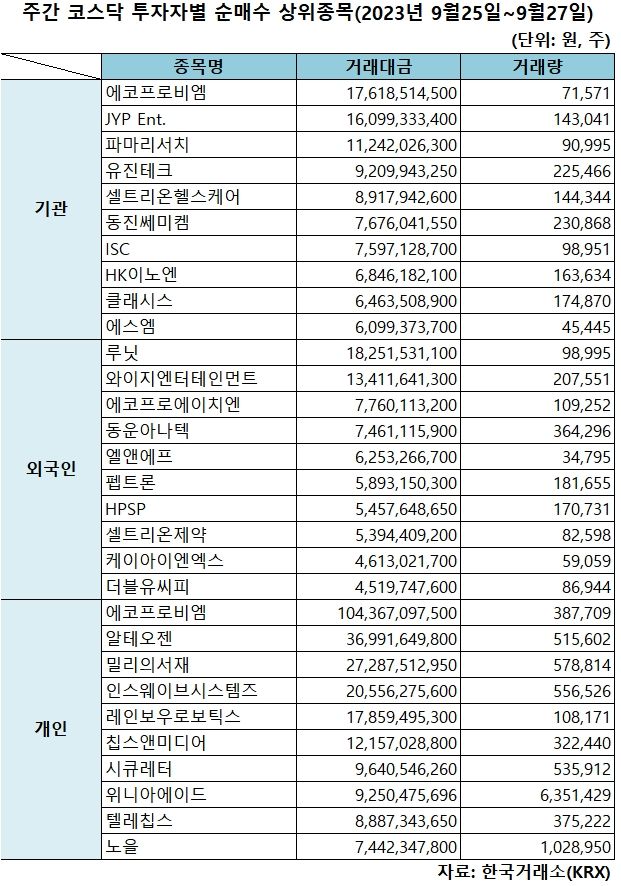 기관 '에코프로비엠'·외인 '루닛'·개인 '에코프로비엠' 1위 [주간 코스닥 순매수- 9월25일~9월27일]