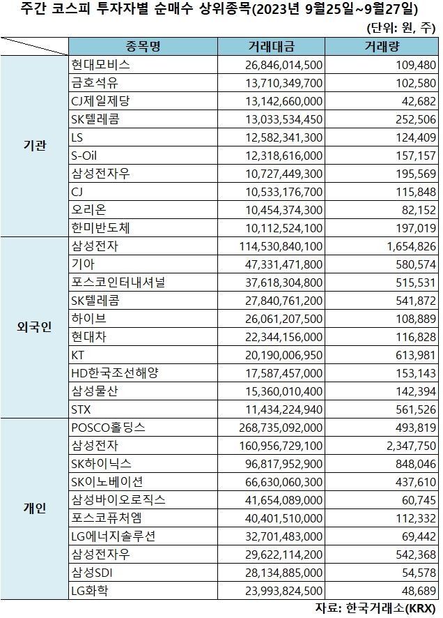 기관 '현대모비스'·외인 '삼성전자'·개인 'POSCO홀딩스' 1위 [주간 코스피 순매수- 9월25일~9월27일]