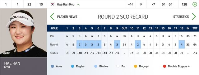 유해란은 이날 보기 없이 버디만 7개 골라내며 7타를 줄여 합계 14언더파 128타를 쳐 공동 2위 니시무라 유나(일본), 해나 그린(호주)을 2타차로 제치고 단독선두를 지켰다.