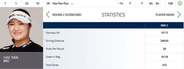 유해란은 이날 드라이브 평균거리 268야드, 페어웨이 안착은 10개, 그린적중은 16개, 퍼트수는 28개로 잘 막았다.