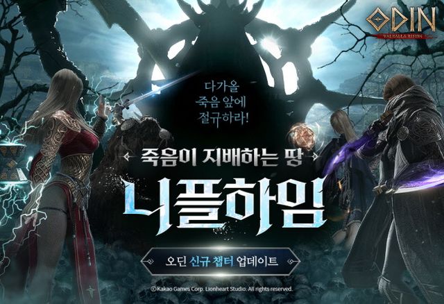 '오딘'의 7번째 대륙 '니플하임'은 죽음의 세계라는 설정에 따라 짙게 깔린 어둠과 안개, 뱀의 뼈로 만들어진 지형이 특징이며, 기존보다 강력한 보스들, 신규 파티 던전 등 다양한 콘텐츠를 만날 수 있다.