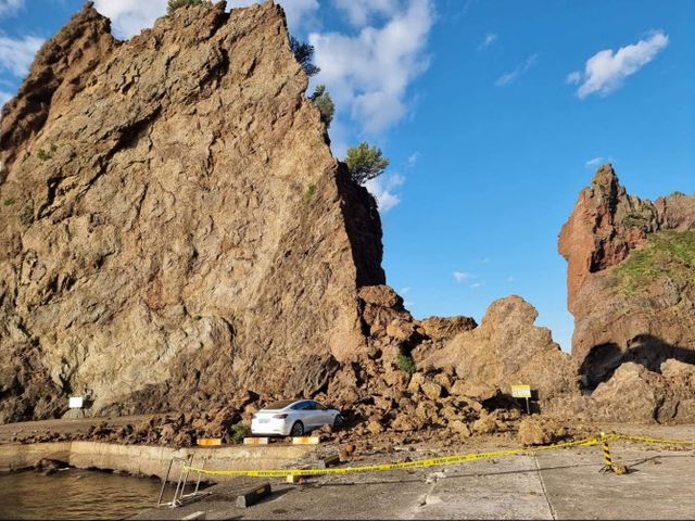 2일 경북소방본부 등에 따르면 이날 오전 6시56분경 경북 울릉군 서면 남양리 거북바위 머리 부분이 무너져내리면서 50t 가량의 낙석이 인근에 있던 관광객 4명을 덮쳤다.