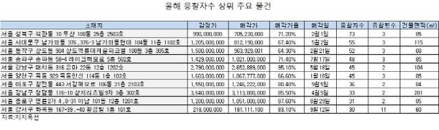 서울 동작구 상도역 롯데캐슬파크에 전용 60㎡와 서울 양천구 목동 한신 85㎡ 또한 응찰자가 각각 52명, 45명 몰리기도 했다.