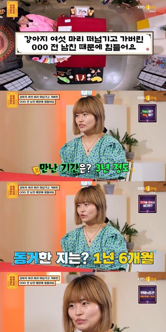 2일 방송된 KBS Joy '무엇이든 물어보살'(이하 '물어보살')에는 무명 아이돌과 사귀었던 여자가 무물이로 찾아왔다. 남자친구에게 수백만 원을 쓰고 강아지도 6마리를 키우게 됐지만, 남자친구는 헤어진 뒤 나 몰라라 한다고.
