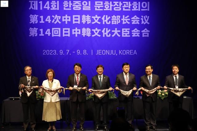 9月8日,第14届韩中日文化部长会议在韩国全州举行。图为日本文部科学大臣永冈桂子(左二)、韩国文化体育观光部长官朴普均(居中)和中国文化和旅游部部长胡和平(右二)等人士出席剪彩仪式。【图片来源 韩联社】